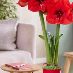 Hippeastrum (commonly known as Amaryllis) are popular for their indoor holiday color and are often given as gifts from October through January. They are easy to grow and are impressive flowers. As bulbs are essentially storage mechanisms, they already contain everything needed to produce flowers. They are tropical and subtropical. All you will need to do is just add water. But best of all, they can be induced to re-bloom indoors for years to come. Three Amaryllis bulbs, sized 24/26 cm, (one red, striped, and white) come pre-planted in a nursery bulb pan with drainage, which is topped with greenish sheet moss for a festive finish. Included are an iron polished brass like decorative premium planter, sized approximately 8″x 8″x 5″, plus stand.