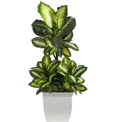 The Dieffenbachia, known as the dumb cane, is a common houseplant with a bad reputation for being poisonous to pets and humans. The good news is that you can still bring home an artificial dumb cane plant that looks just like the real thing with variegation in full display. Large, glossy leaves with an intricate, detailed pattern sprout from bendable branches – allowing you to shape and fluff. Standing 46″ from a white metal planter, this plant is perfect for any space. Curate in your offices, bathrooms, kitchens, or foyers. Silk plants are manufactured using synthetic materials, such as polyester material or plastic, and are well designed and constructed to be life-like in appearance. This item will need to be re-shaped when removed from the secure box to allow it to reach its fullest size. Your artificial plant will look beautiful for years to come; simply wipe clean with a soft dry cloth when needed.